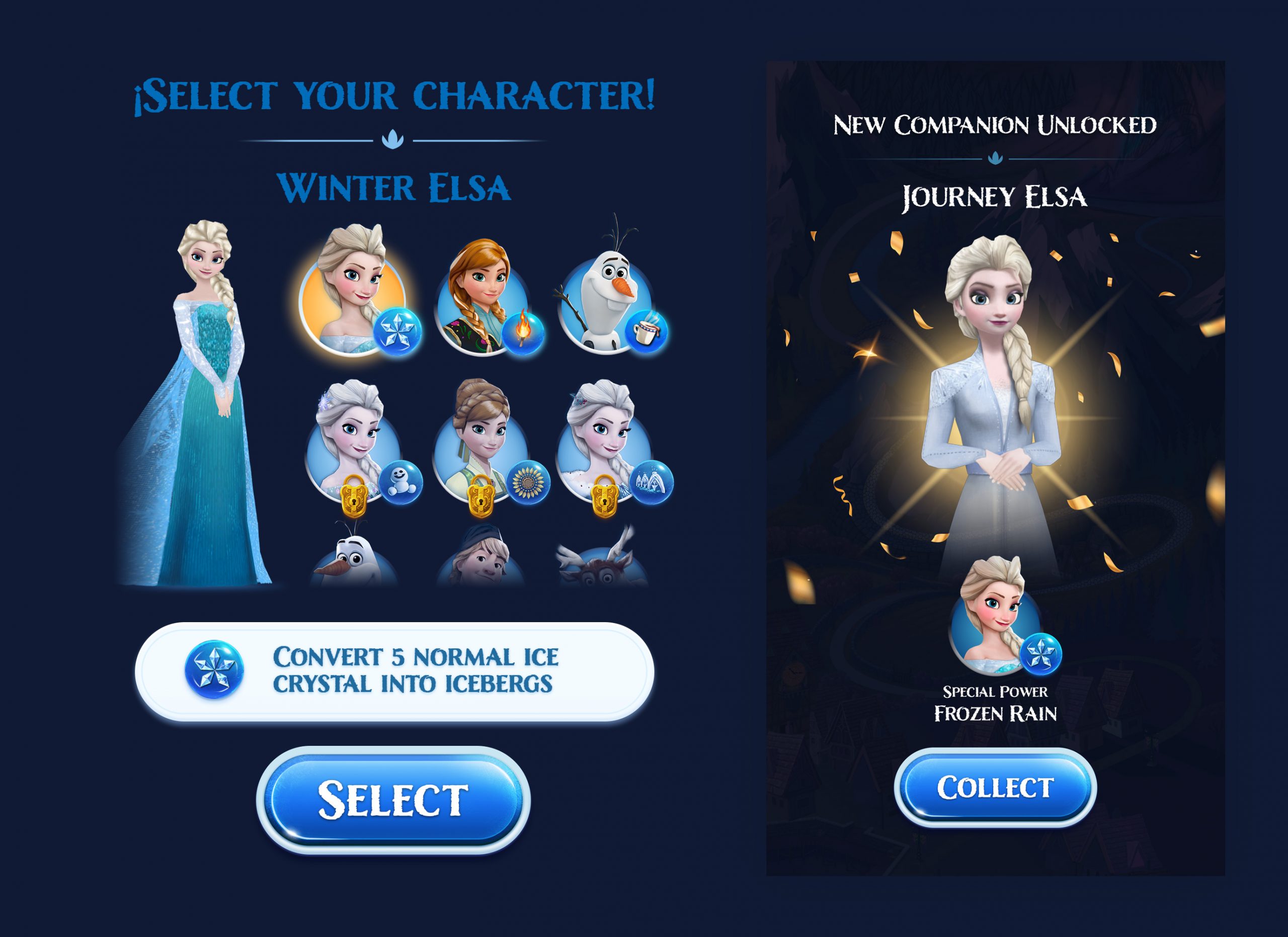 The whole UI was inspired by the ice. The color palette was mainly cold, it helped to pop the rest of the elements up, as icons, buttons and the Frozen characters, the most important thing through the game.